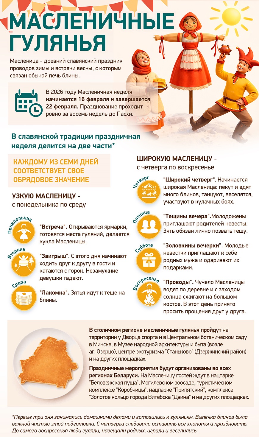 В 2026 году Масленичная неделя начинается 16 февраля и завершается 22 февраля. Празднование проходит ровно за восемь недель до Пасхи.